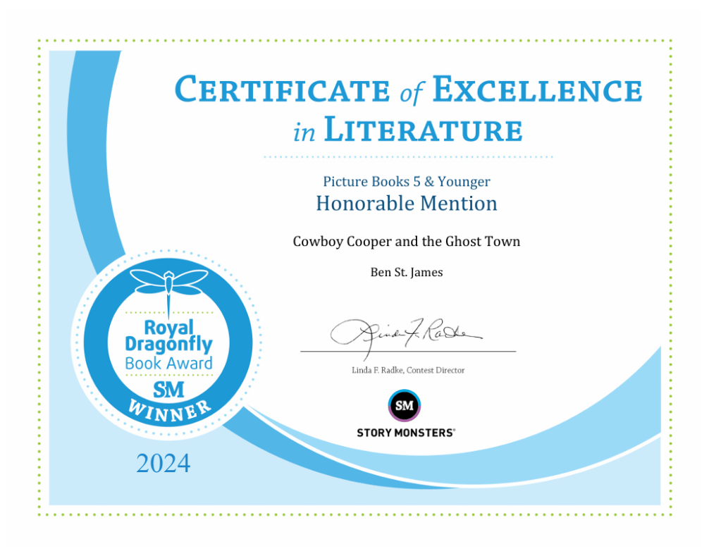 I’m pleased to share that my latest book, Cowboy Cooper, earned recognition in two categories! The book received an Honorable Mention in Picture Books 5 and Younger and took home 1st Place in the Western category. Cowboy Cooper & the Ghost town is the first children’s picture book to win or be recognized in the category.