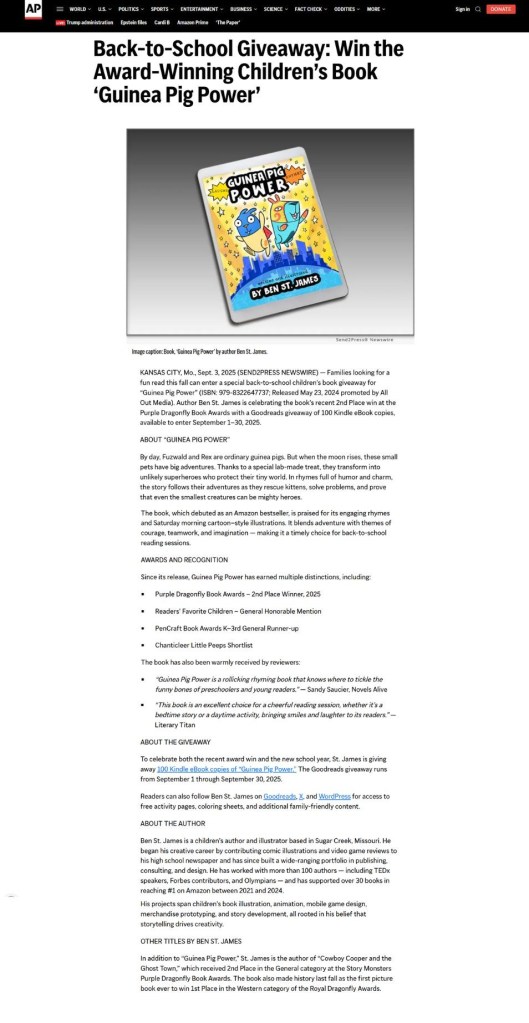 Guinea Pig Power has also been recognized with awards like 2nd Place at the Purple Dragonfly Book Awards, an Honorable Mention from Readers’ Favorite, and a Runner-up at the PenCraft Book Awards. The story’s playful rhymes and Saturday-morning-cartoon-style illustrations make it a rollicking read for kids, blending adventure with courage, teamwork, and imagination.