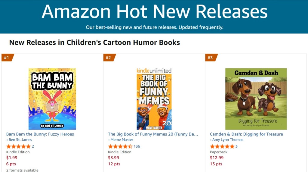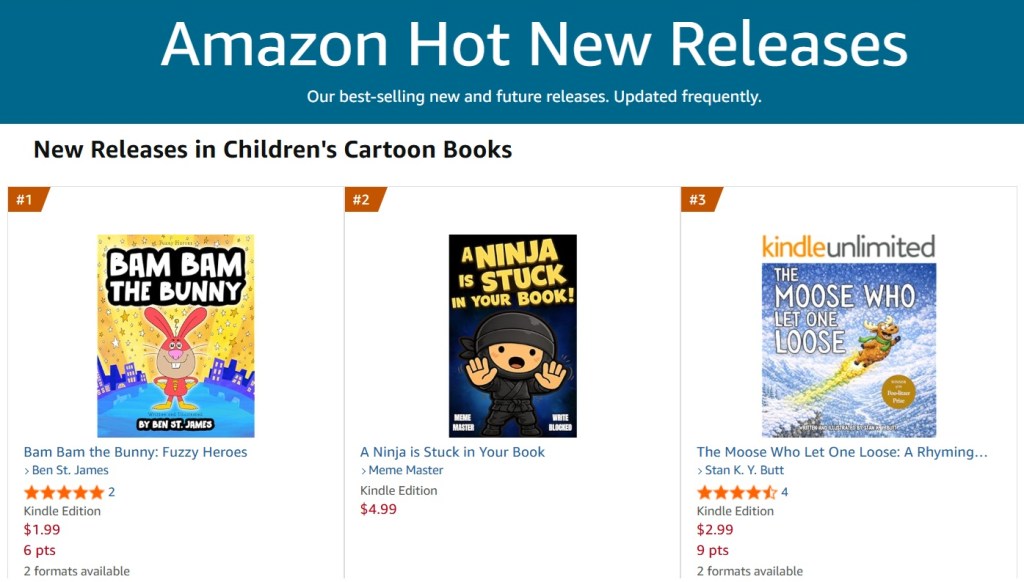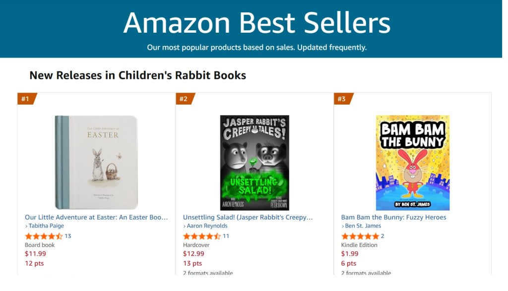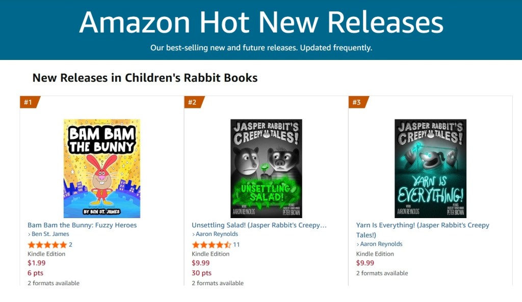 In the New Releases in Children’s Rabbit Books category, Bam Bam the Bunny displacing Unsettling Salad! (Jasper Rabbit’s Creepy Tales!) by Aaron Reynolds, published by Simon & Schuster, which had previously held the top position.