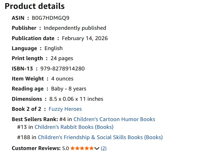 These rankings signal growing visibility for the Fuzzy Heroes picture book series, positioning it among the top-performing children’s books in its genres.