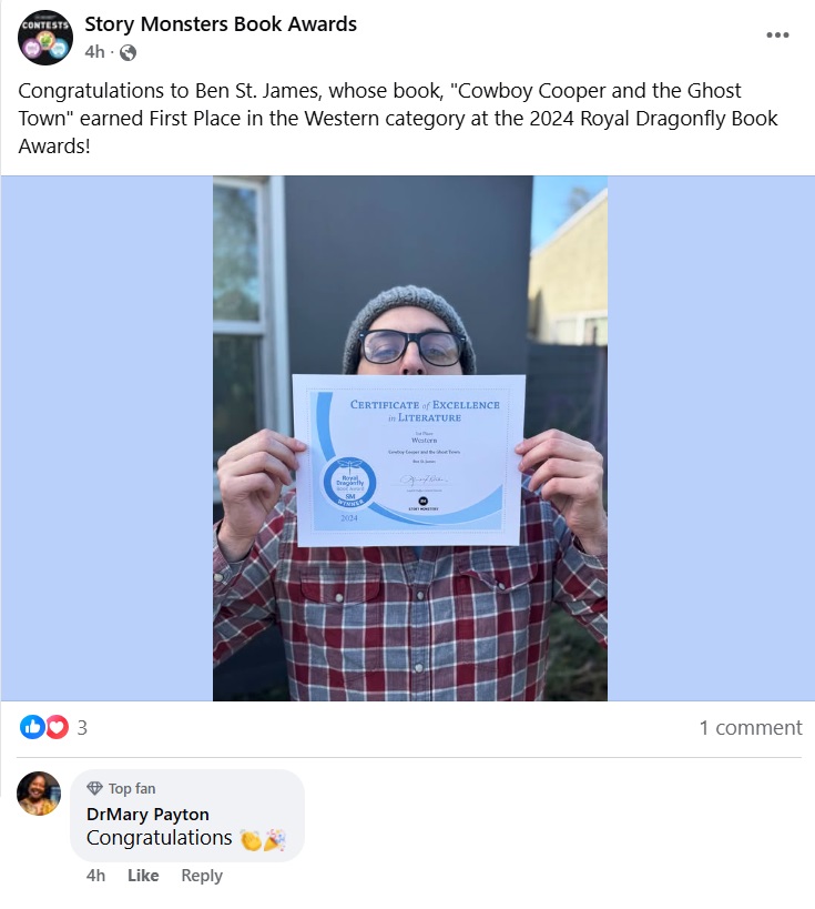 I’m pleased to share that my latest book, Cowboy Cooper, earned recognition in two categories! The book received an Honorable Mention in Picture Books 5 and Younger and took home 1st Place in the Western category. Cowboy Cooper & the Ghost town is the first children’s picture book to win or be recognized in the category.